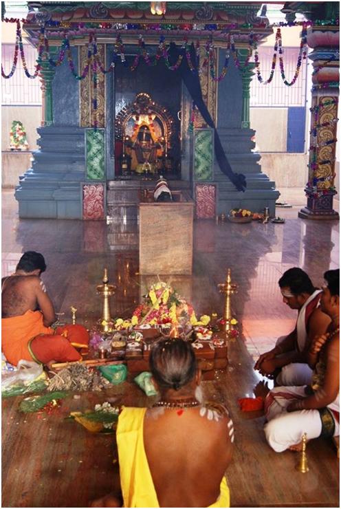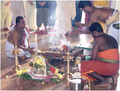 Luego, siempre temprano en la mañana, hubo un Ganapati homa, es decir una ceremonia de fuego para propiciar un buen día de celebraciones. El homa fue realizado por sacerdotes brāhmanas.