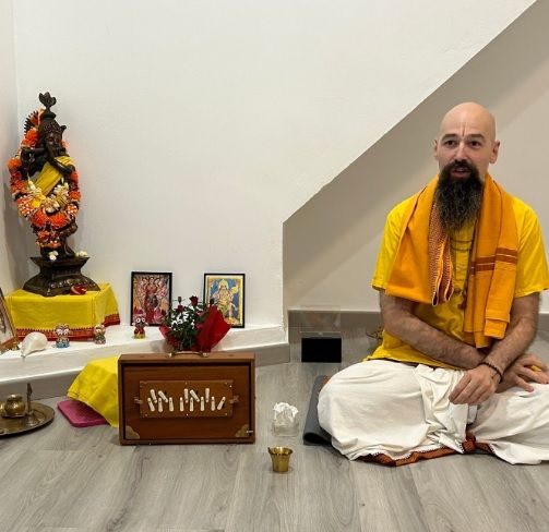 Bajo el auspicio del Templo Hindú de Valencia-Sivananda Mandir estudió durante seis años sánscrito, Escrituras del Yoga y del Vedānta, filosofía hindú y rituales védicos en las tradiciones Smarta y Pancharatrika. Durante un año más residió allí como pujari o sacerdote. Estudió Jyotisha o astrología védica bajo la guía de Sriman Guneshvara Dasa.
